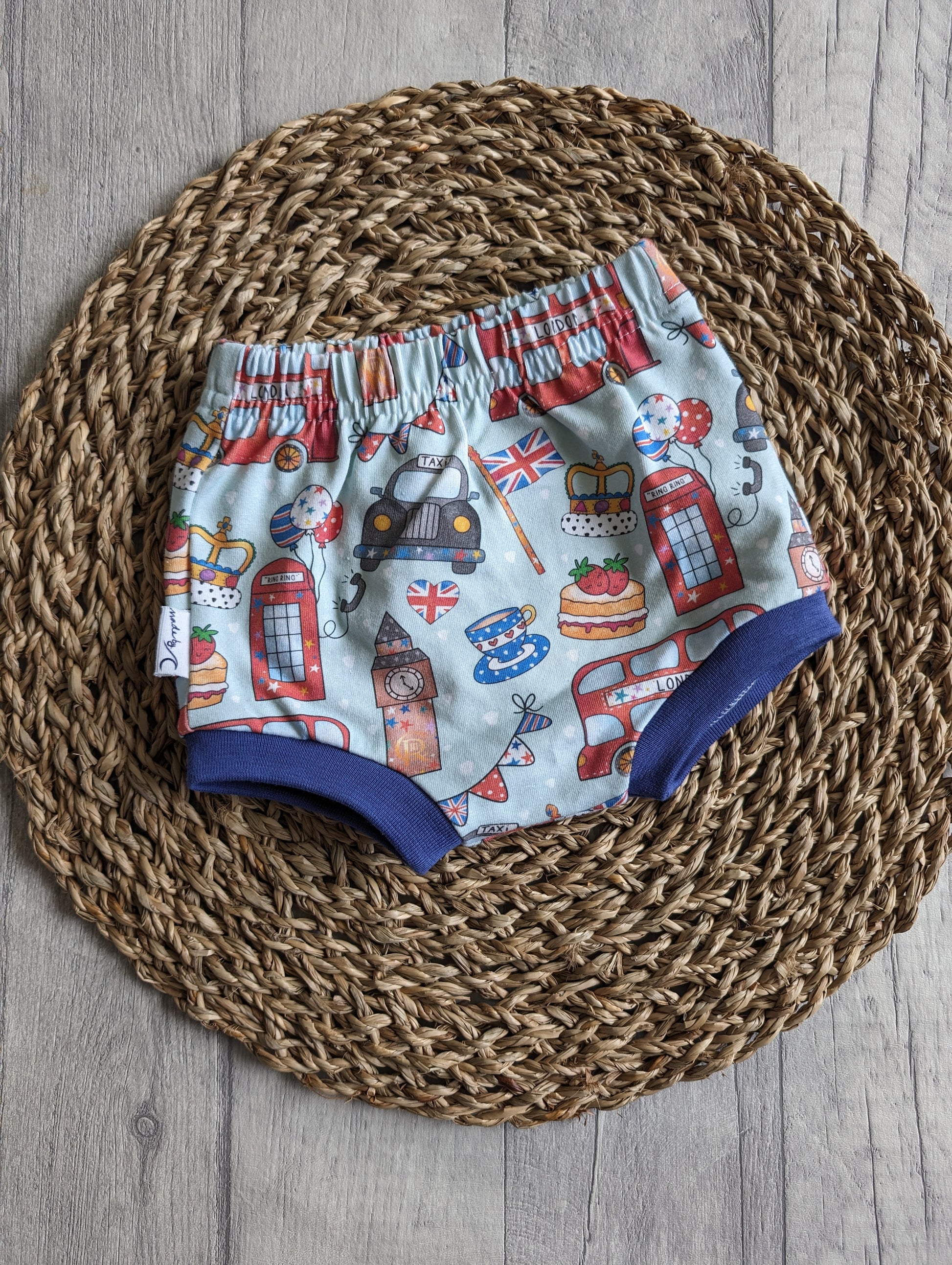 Our bummies are a relaxed fit bummie/bloomer type short, they finish at the top of the thighs with a jersey band. They have an enclosed and fixed elasticated waistband. Cloth nappy friendly.