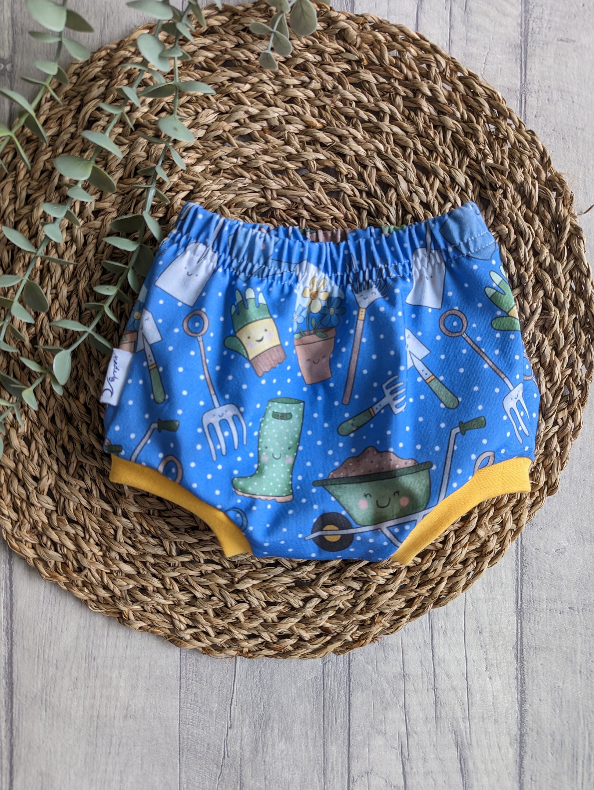 Our bummies are a relaxed fit bummie/bloomer type short, they finish at the top of the thighs with a jersey band. They have an enclosed and fixed elasticated waistband. Cloth nappy friendly.