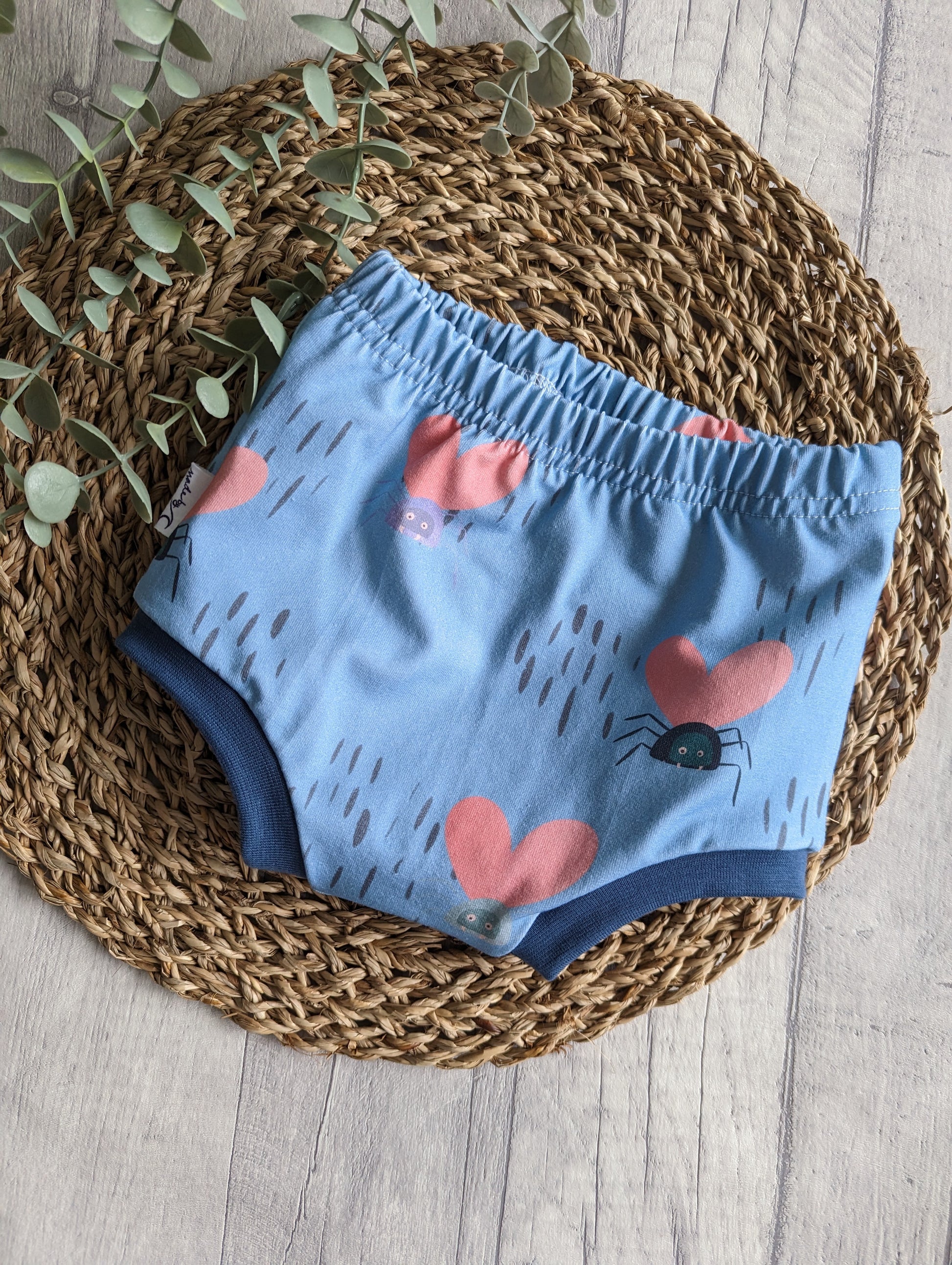 Our bummies are a relaxed fit bummie/bloomer type short, they finish at the top of the thighs with a jersey band. They have an enclosed and fixed elasticated waistband. Cloth nappy friendly.