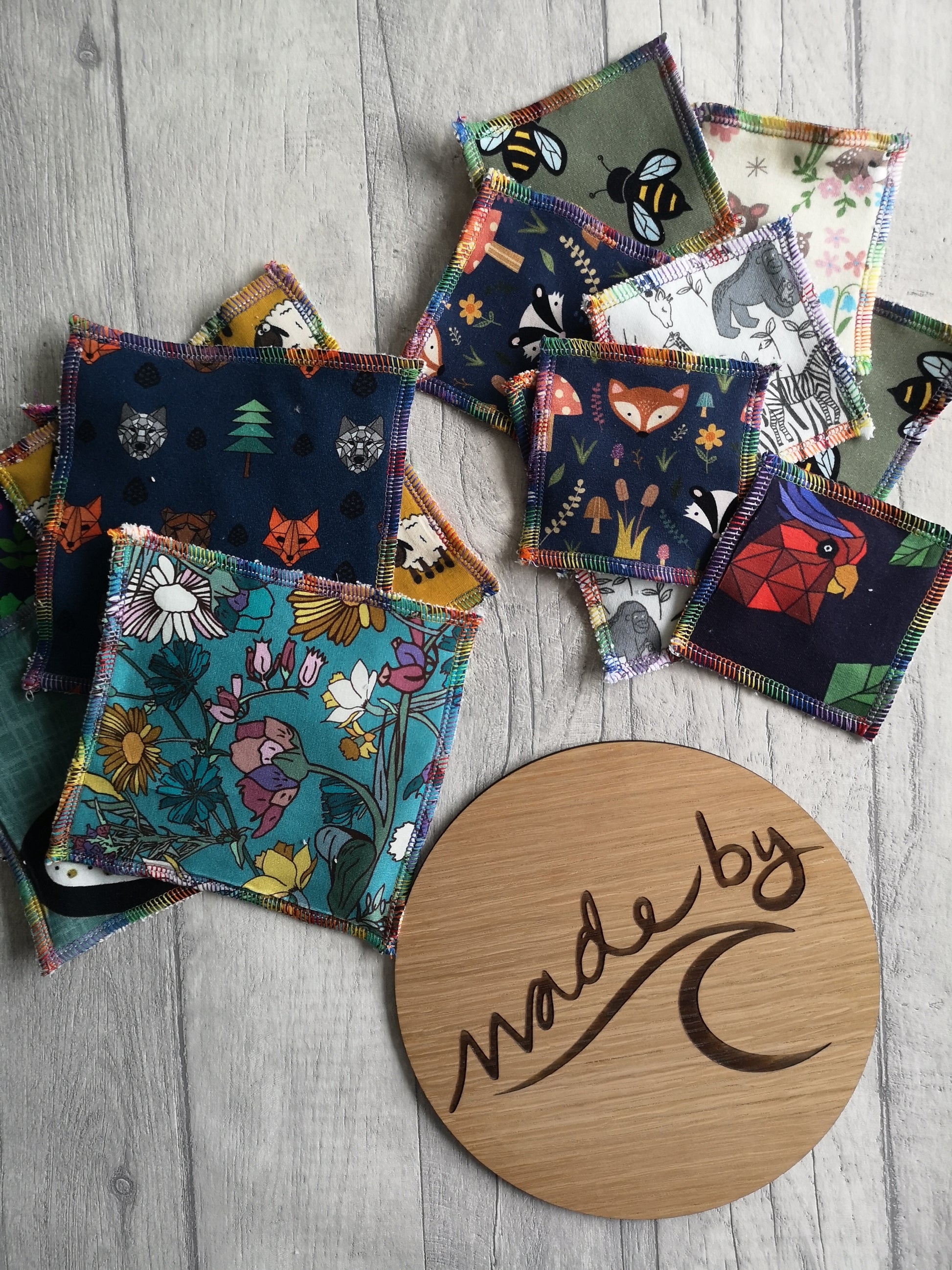 Cloths: approx 15cmx15cm, perfect as a wash cloth for children, baby wipe or general household cloth. They are £2 individually or 3 for £5.