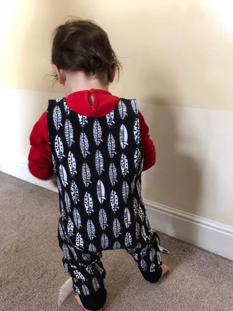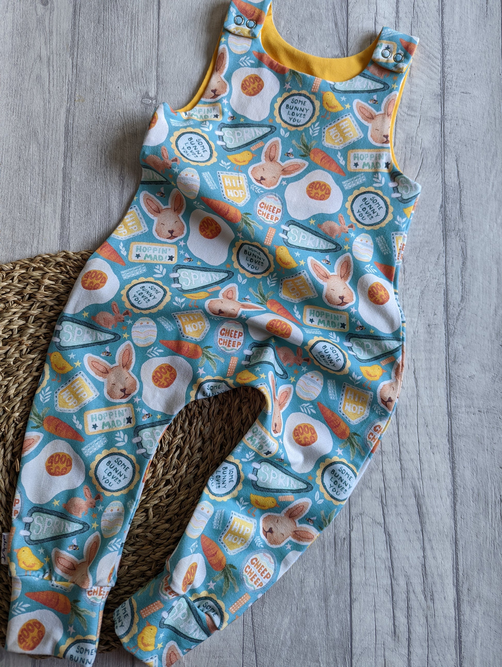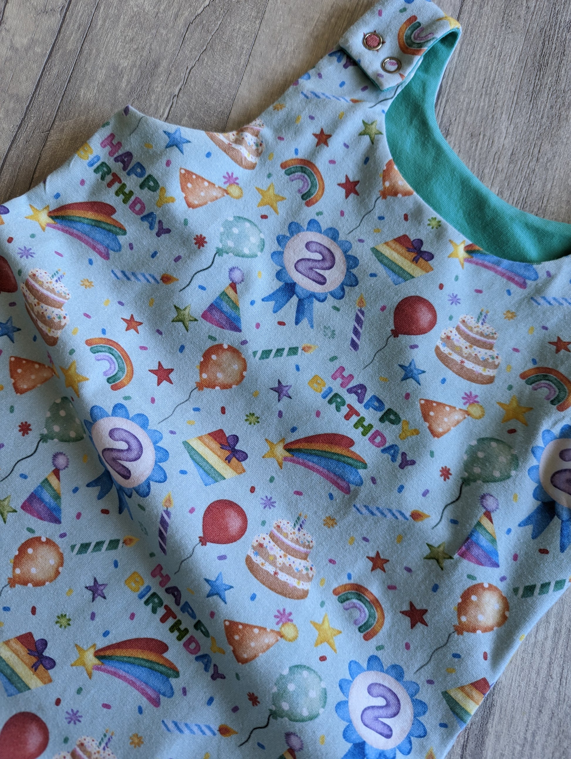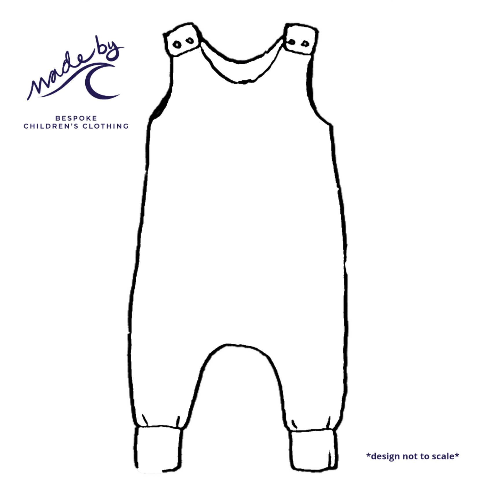 Our rompers are semi-lined with a plain coordinating fabric and matching cuffs. Cuffs are long length, meaning you can start with them turned up and turn down to add extra length if needed or to prolong their use. They fasten with two poppers at the shoulders.