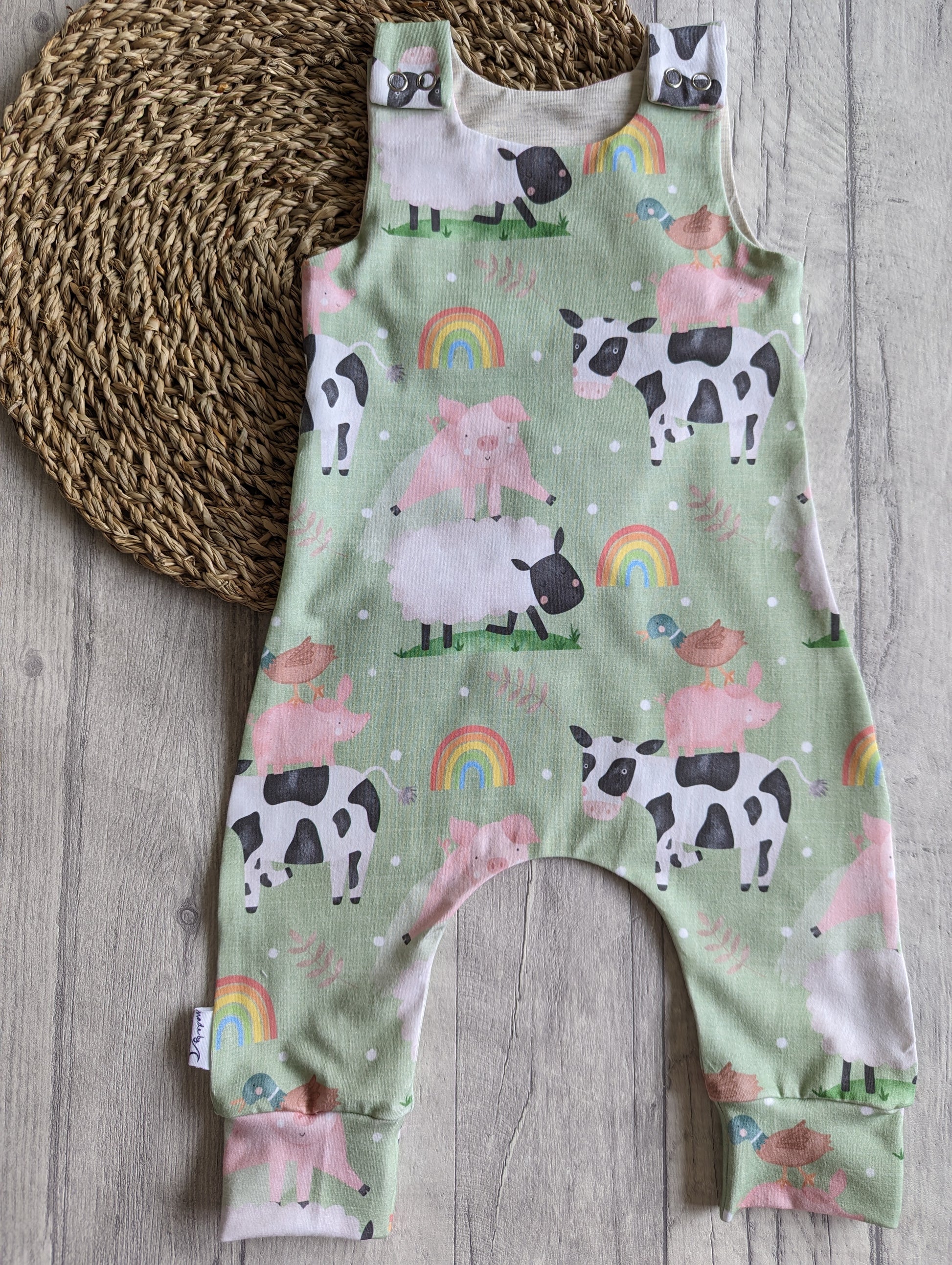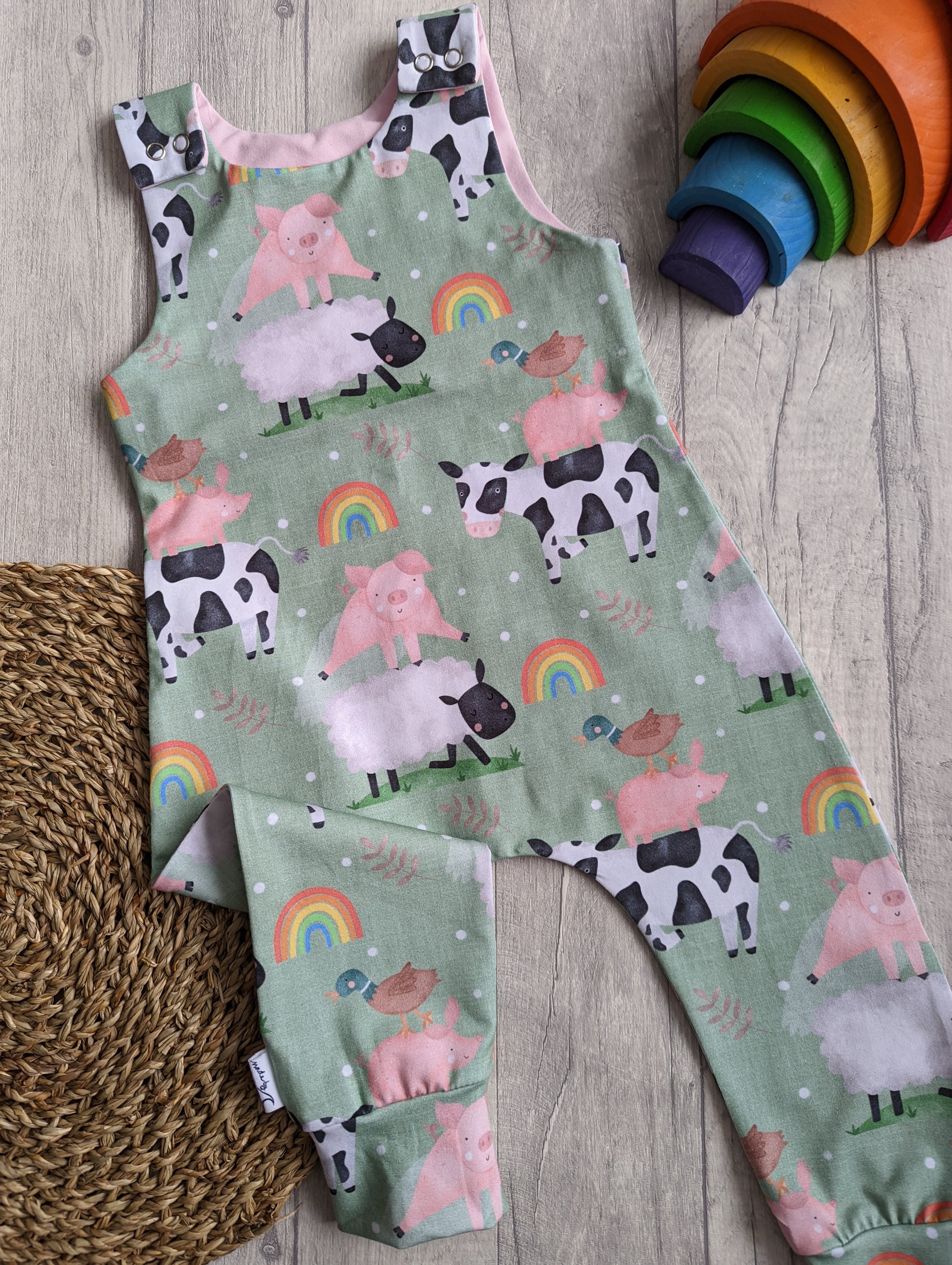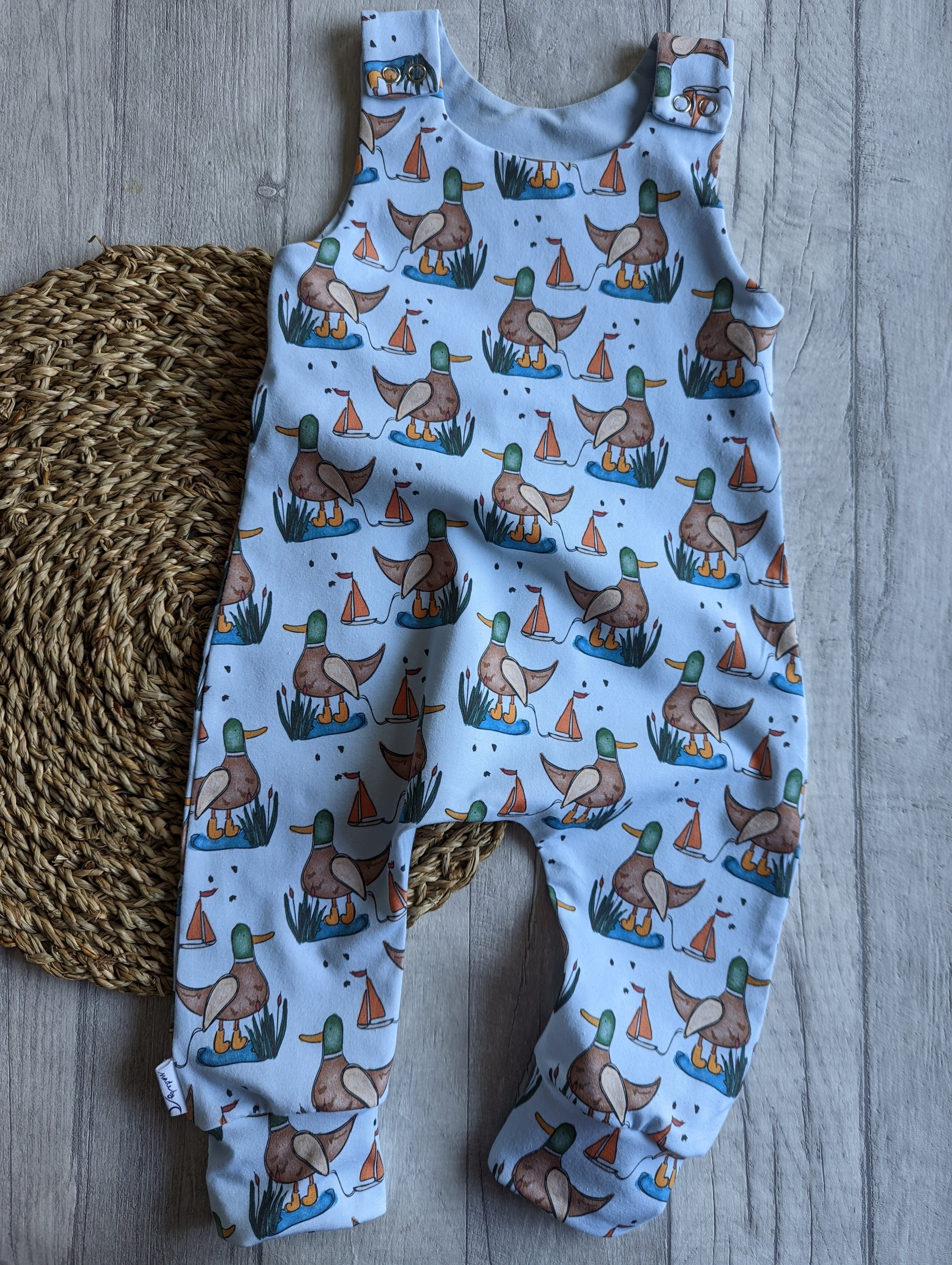 Our rompers are semi-lined with a plain coordinating fabric and matching cuffs. Cuffs are long length, meaning you can start with them turned up and turn down to add extra length if needed or to prolong their use. They fasten with two poppers at the shoulders.