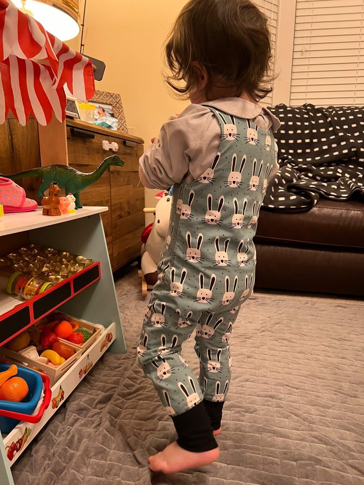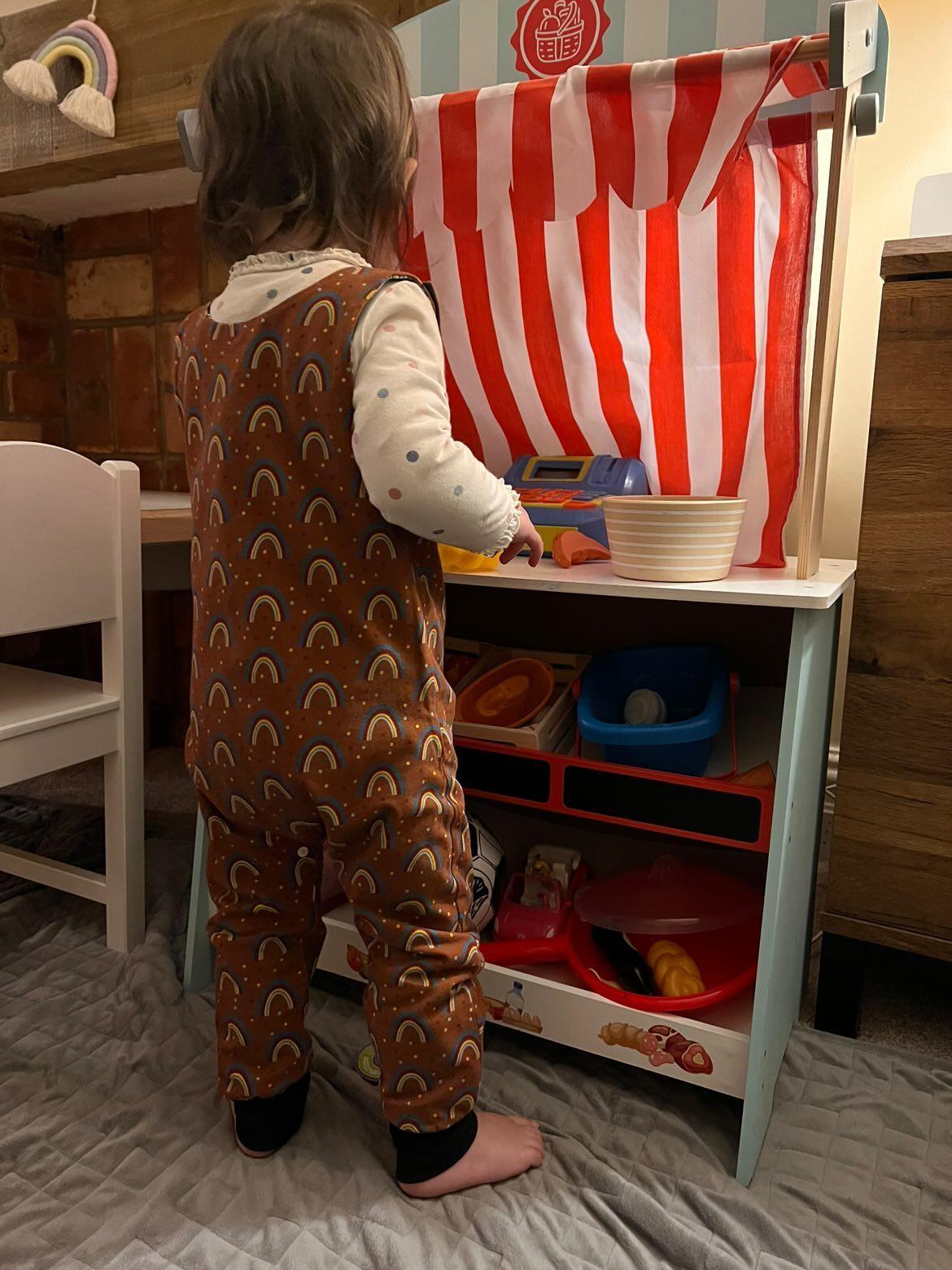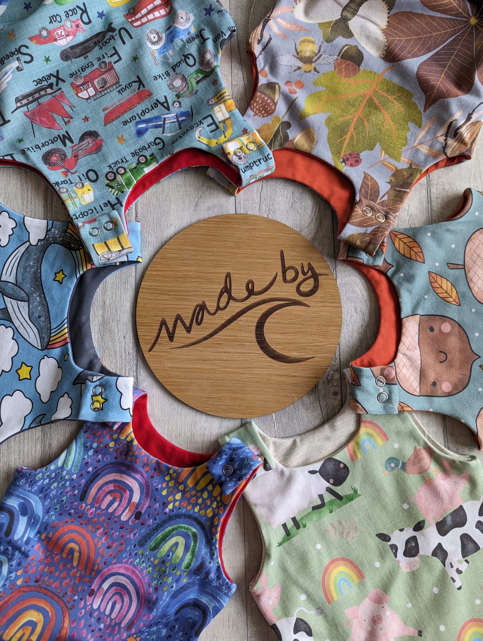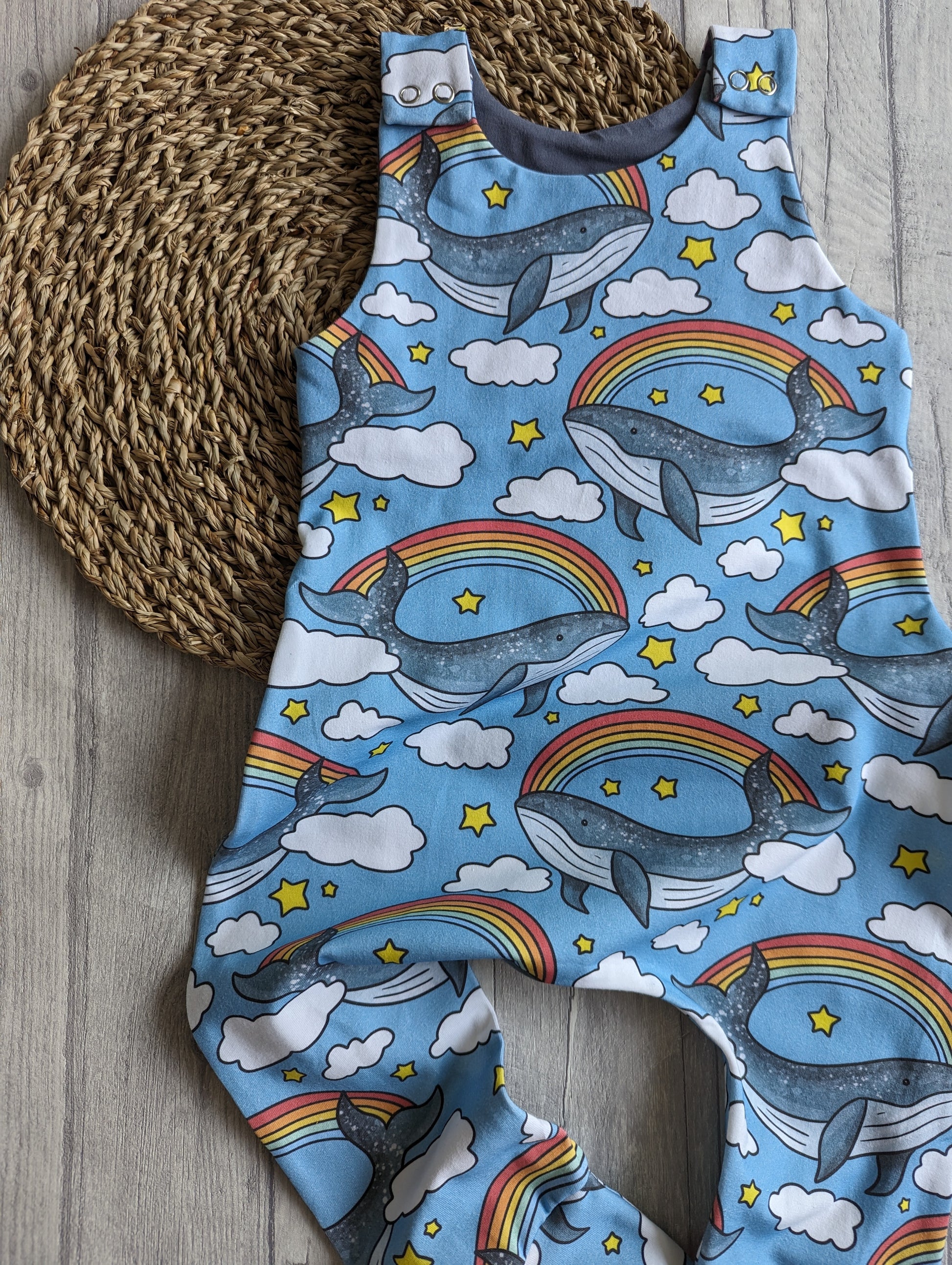 Our rompers are semi-lined with a plain coordinating fabric and matching cuffs. Cuffs are long length, meaning you can start with them turned up and turn down to add extra length if needed or to prolong their use. They fasten with two poppers at the shoulders.