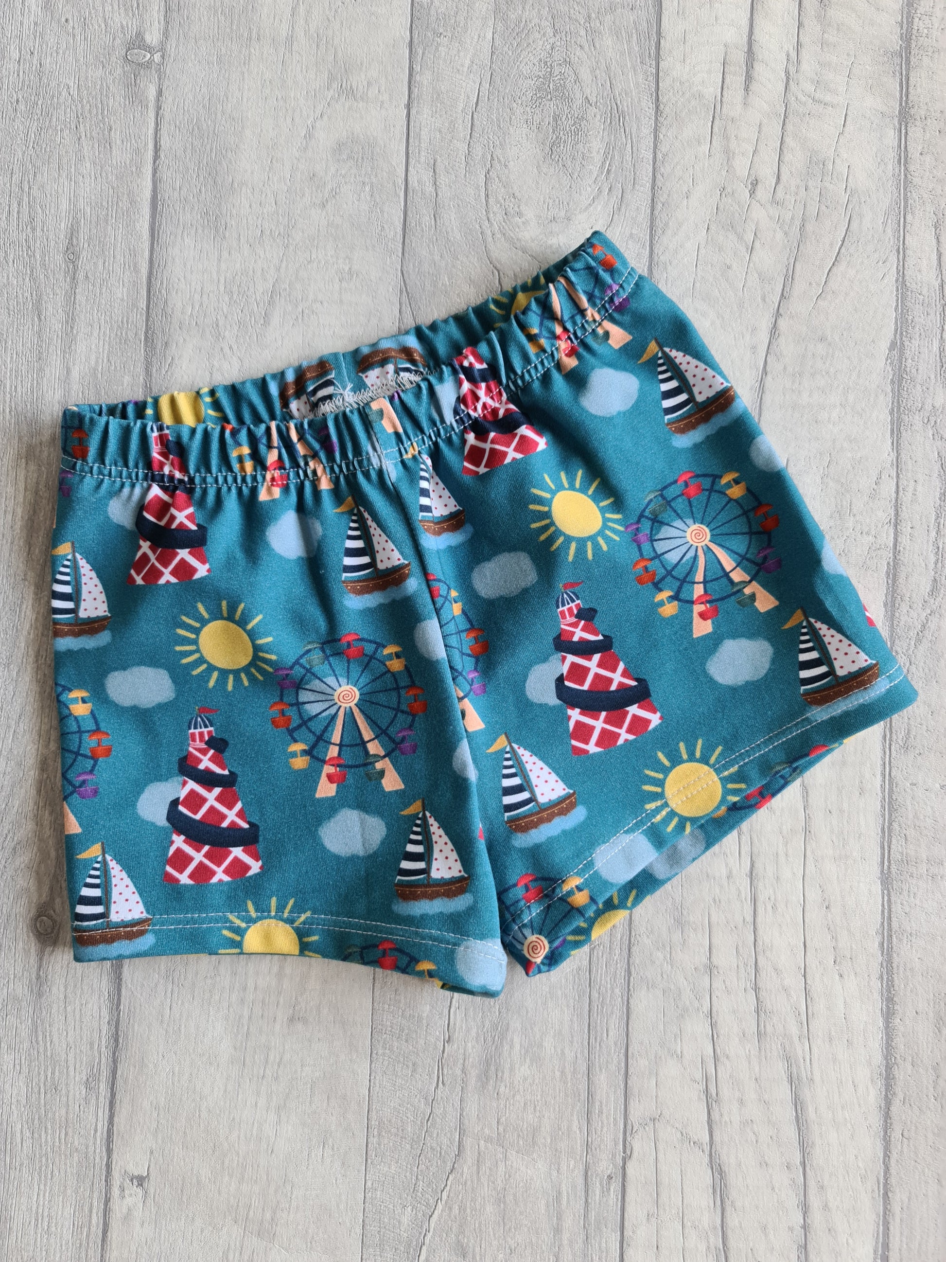 A loose fit shorts style with an elasticated waistband - super comfy and cool! They are approximately mid thigh - knee length.