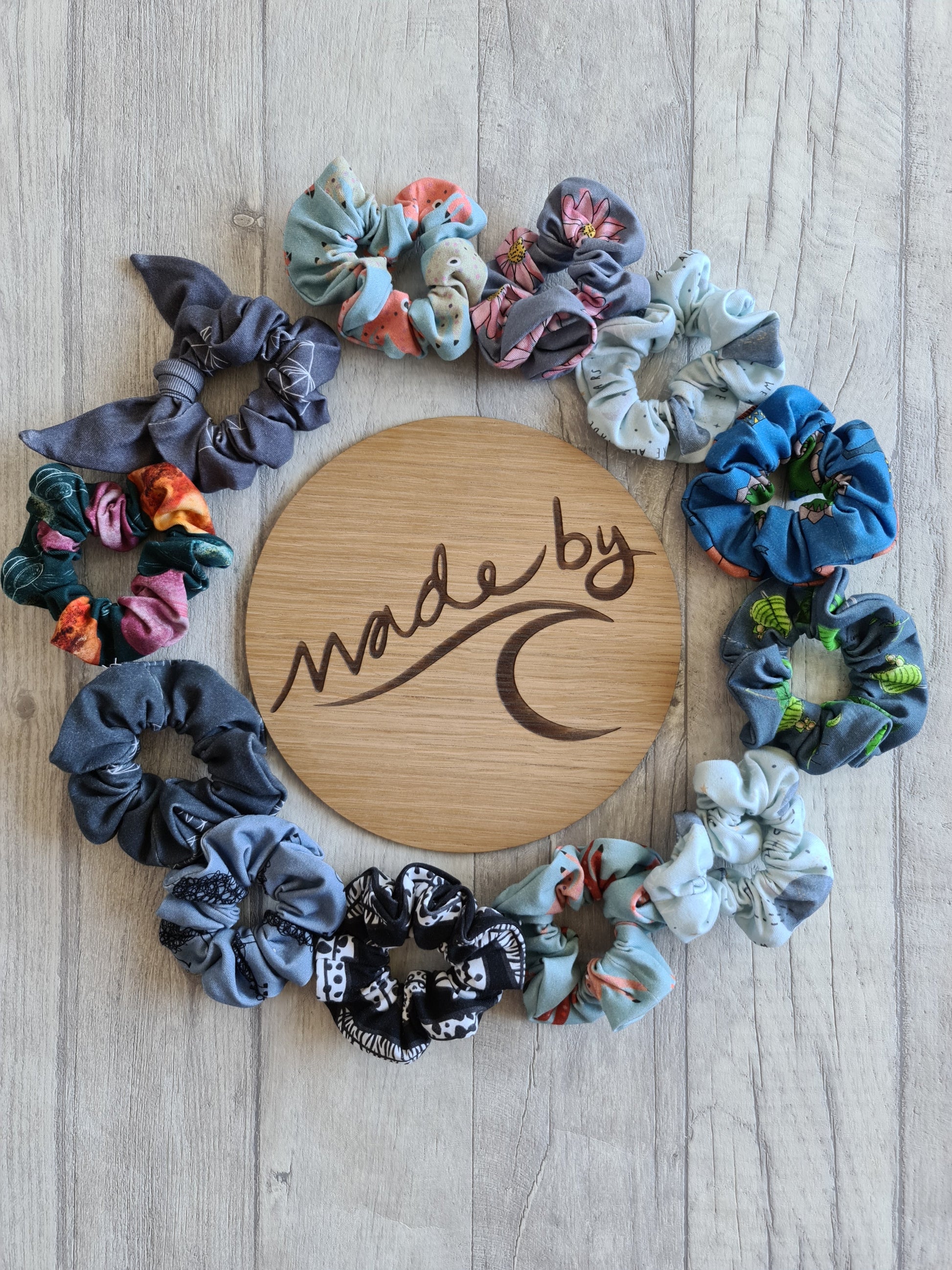 Our Scrunchies are made using cotton jersey in our prints. Get a surprise bundle of 5 for £5! Suprrise options could be a variety of any of our current/past fabrics - you can leave requests at checkout if you'd rather not have/have a particular theme/colour. E.g. no florals, no pinks, bright colours,