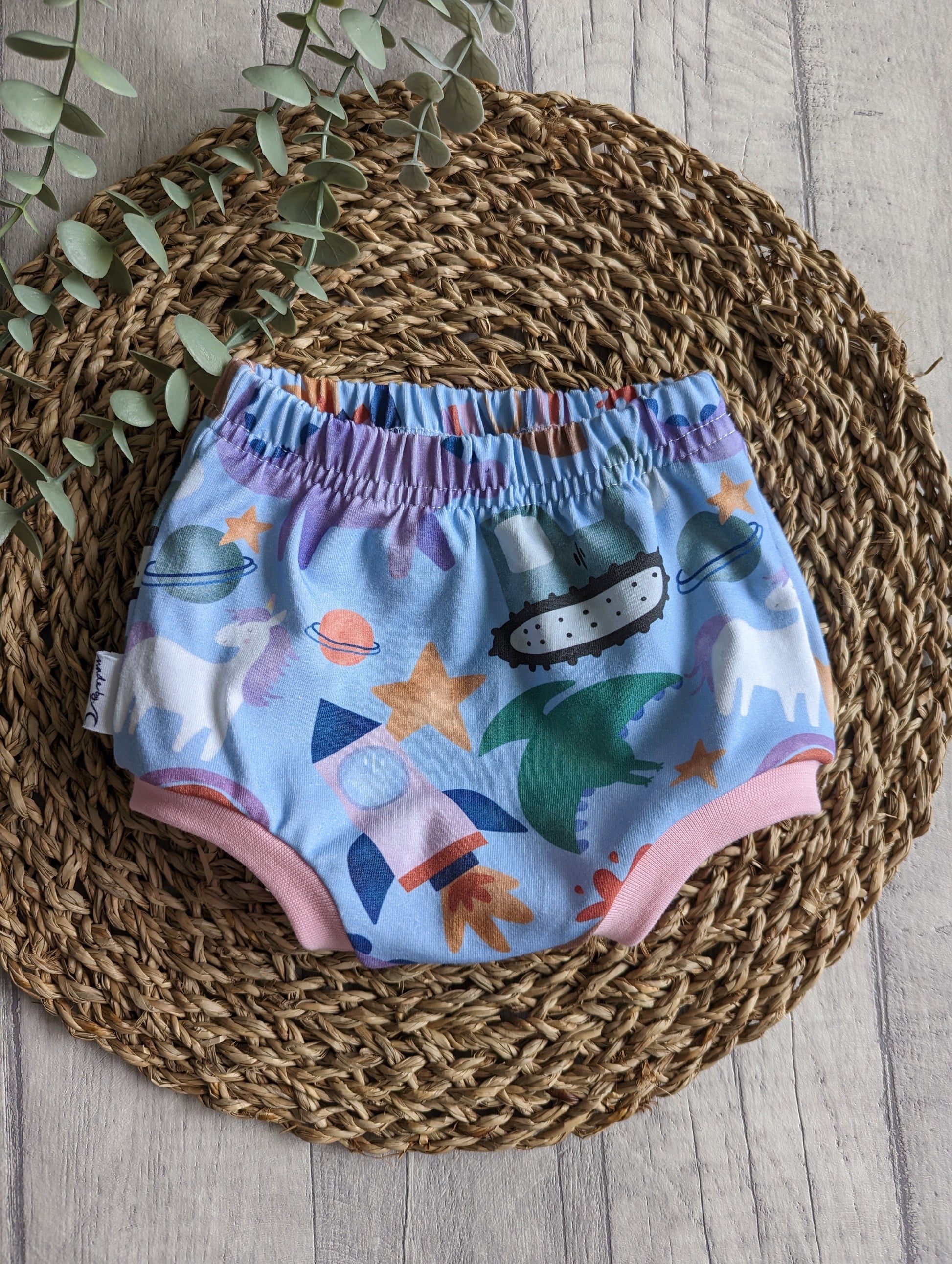 Our bummies are a relaxed fit bummie/bloomer type short, they finish at the top of the thighs with a jersey band. They have an enclosed and fixed elasticated waistband. Cloth nappy friendly.